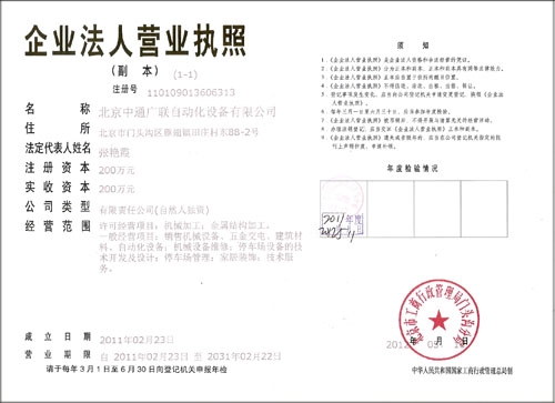 - 北京中通廣聯自動化設備有限公司是一家專業從事停車設備維修保養的服務公司,成立于2008年2月,公司主營業務是為停車設備制造廠家、物業公司提供專業服務。