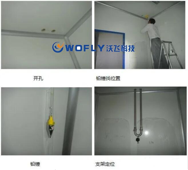 安裝時(shí),先在頂棚打出與管道同尺寸的孔洞,將固強(qiáng)套管固定在孔洞上,然后再將做好的支吊架自下而上的穿過頂棚,按照預(yù)設(shè)的高度,將支架固定在墻面上。
